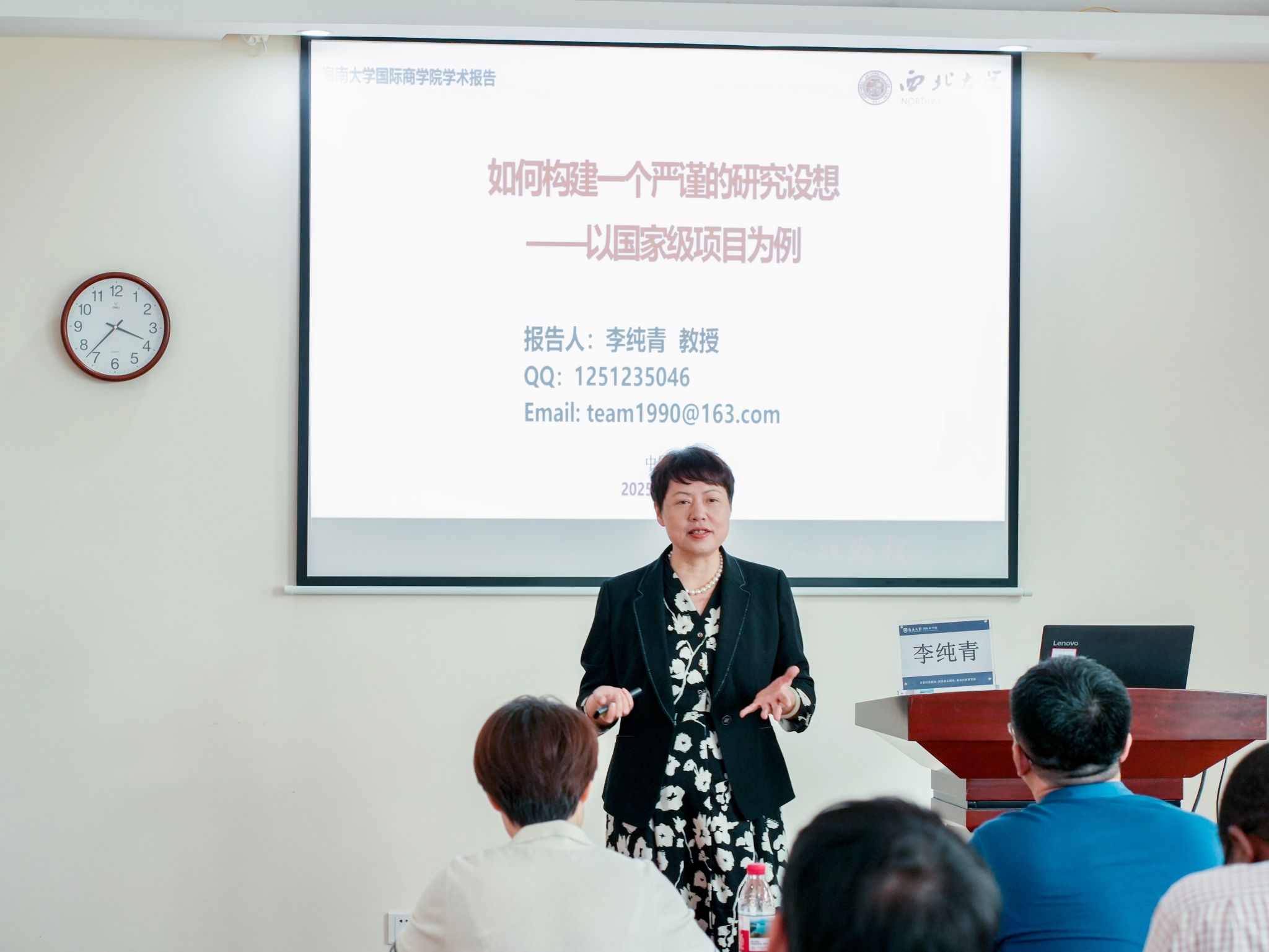 会议伊始,付景涛副院长简要介绍了李纯青教授在相关领域的突出学术成就与贡献。随后,李纯青教授做了题为“如何构建一个严谨的研究设想——以国家级项目申报为例”的专题报告。报告中,李教授重点阐述了国家级项目申报的关键环节与核心要点。她强调,选题是申报成功的关键,建议申报者需紧密围绕国家重大战略需求,将学科前沿探索与国家实际需要相结合。李教授结合自身丰富的申报经验,分享了从选题凝练、文献综述到研究框架设计的实用策略,展现研究项目的独特性和科学价值。