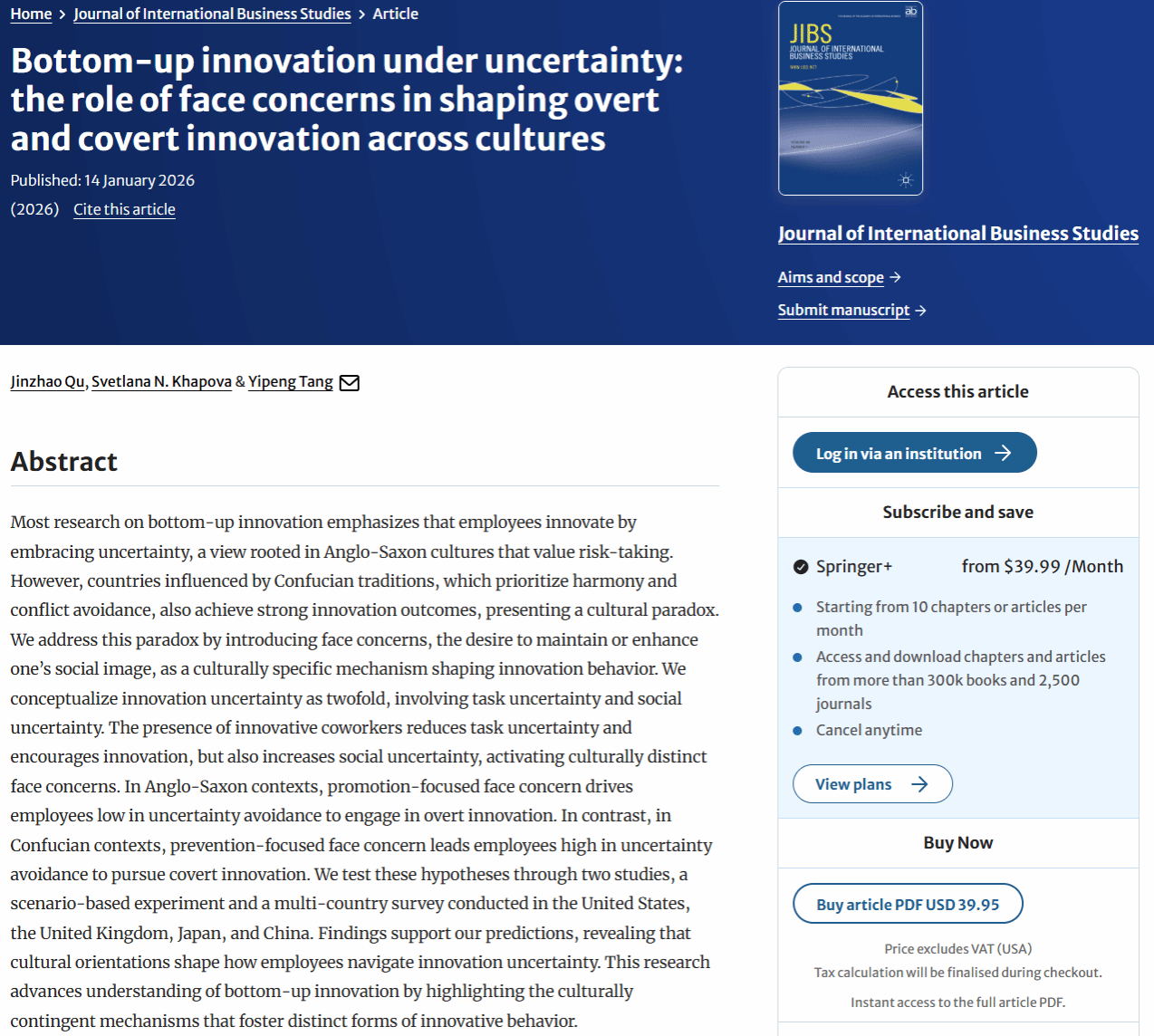 工商管理系屈金照副教授作为第一作者,与阿姆斯特丹自由大学(Vrije Universiteit Amsterdam)Svetlana N. Khapova教授和中南财经政法大学汤一鹏副教授合作完成学术论文《Bottom-up innovation under uncertainty: the role of face concerns in shaping overt and covert innovation across cultures》在管理学领域国际顶级期刊《Journal of International Business Studies》正式在线发表。该期刊为UTD24期刊之一,是国际商科协会(Academy of International Business;AIB)的旗舰刊物,是国际商科公认的最高水平期刊。